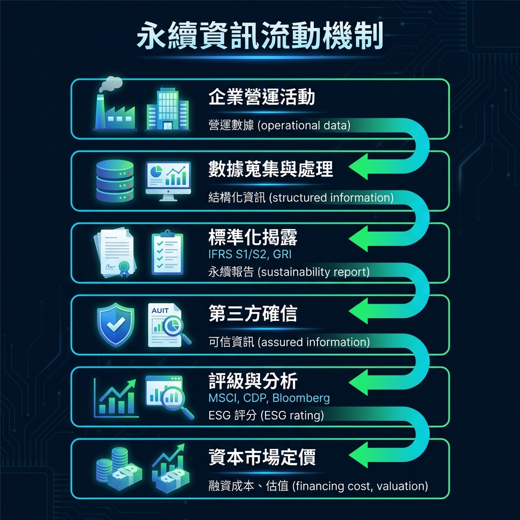 永續資訊流動機制圖 - 從企業營運到資本市場定價的完整流程