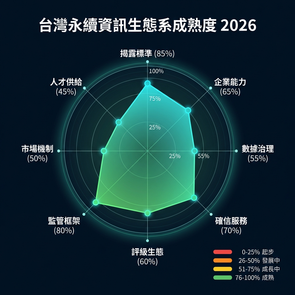 台灣永續資訊生態系成熟度雷達圖 2026 - 8 個維度的發展評估